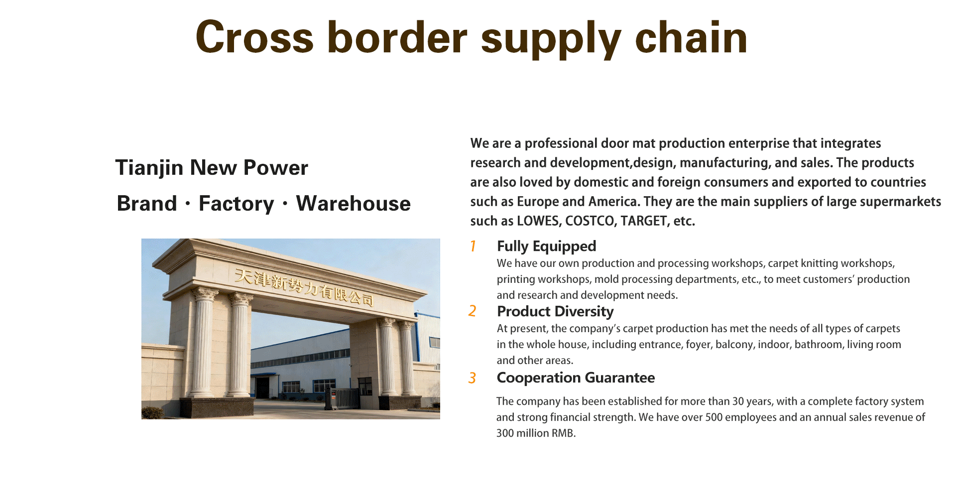 We are a direct sales carpet manufacturer with over 20 years of production experience. Our factory is located in Tianjin, China.